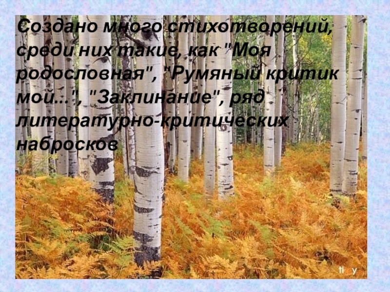 Слайд 25Создано много стихотворений, среди них такие, как "Моя родословная", "Румяный критик