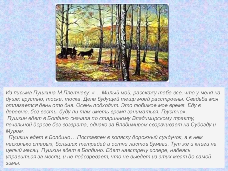 Слайд 9Пушкин пишет Плетневу: «Осень подходит. Это любимое мое время … Еду