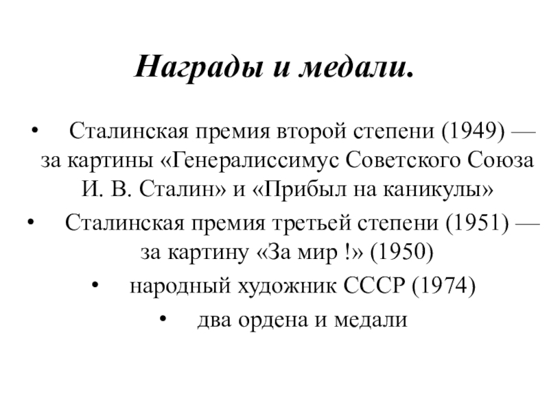 Награды и медали.   Сталинская премия второй степени (1949) — за картины «Генералиссимус Советского Союза И.