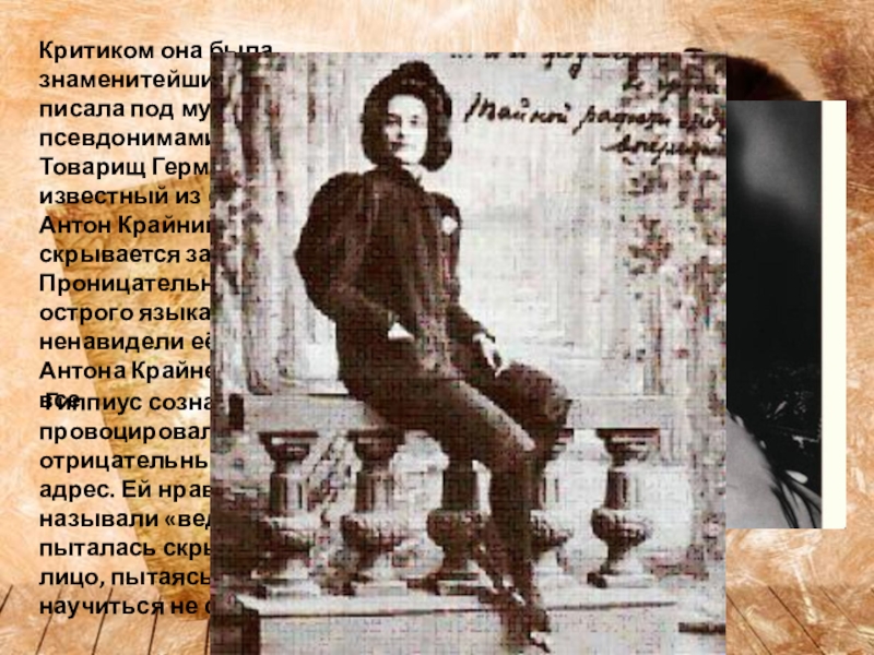 Гиппиус сознательно провоцировала окружающих на отрицательные чувства в свой адрес. Ей нравилось, когда ее называли «ведьмой». Она пыталась скрыть свое истинное лицо, пытаясь таким образом научиться не страдать.