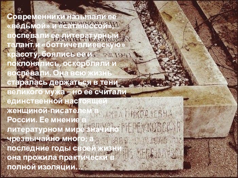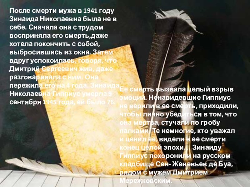 Ее смерть вызвала целый взрыв эмоций. Ненавидевшие Гиппиус не верили в ее смерть, приходили, чтобы лично убедиться в том, что она мертва, стучали по гробу палками. Те немногие, кто уважал и ценил ее, видели в ее смерти конец целой эпохи… Зинаиду Гиппиус похоронили на русском кладбище Сен- Женевьев де Буа, рядом с мужем Дмитрием Мережковским.