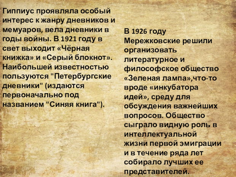 В 1926 году Мережковские решили организовать литературное и философское общество «Зеленая лампа»,что-то вроде «инкубатора идей», среду для обсуждения важнейших вопросов. Общество сыграло видную роль в интеллектуальной жизни первой эмиграции и в течение ряда лет собирало лучших ее представителей.
