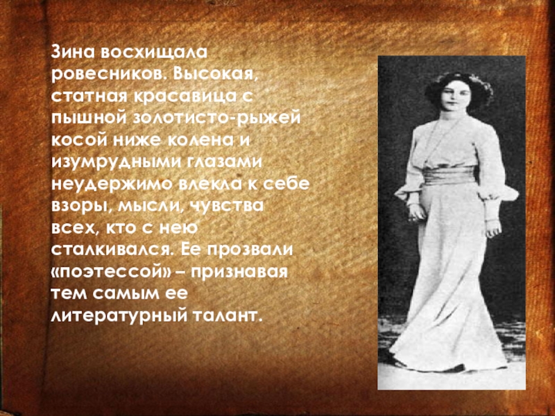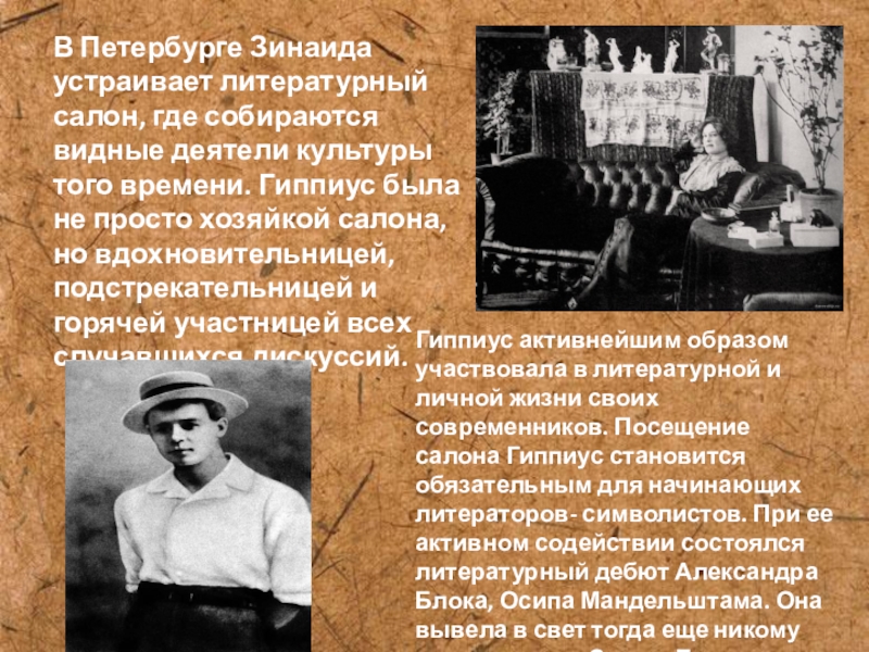 Гиппиус активнейшим образом участвовала в литературной и личной жизни своих современников. Посещение салона Гиппиус становится обязательным для начинающих литераторов- символистов. При ее активном содействии состоялся литературный дебют Александра Блока, Осипа Мандельштама. Она вывела в свет тогда еще никому не известного Сергея Есенина .
