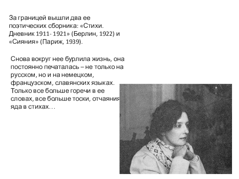Снова вокруг нее бурлила жизнь, она постоянно печаталась – не только на русском, но и на немецком, французском, славянских языках. Только все больше горечи в ее словах, все больше тоски, отчаяния и яда в стихах…