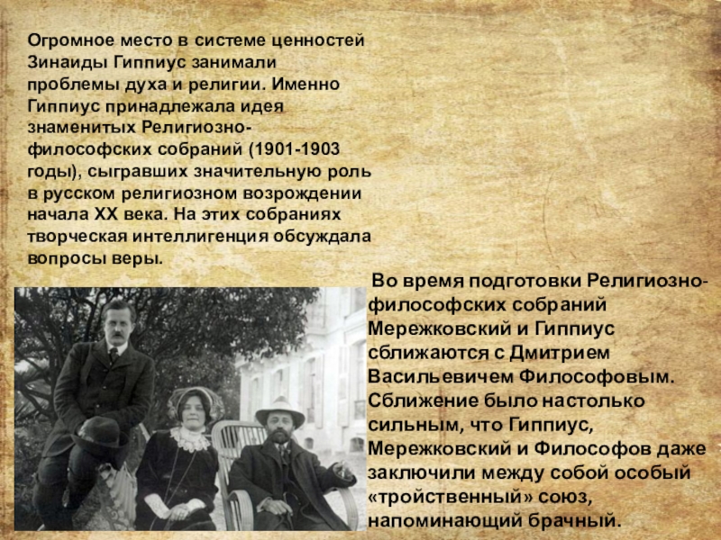Во время подготовки Религиозно-философских собраний Мережковский и Гиппиус сближаются с Дмитрием Васильевичем Философовым. Сближение было настолько сильным, что Гиппиус, Мережковский и Философов даже заключили между собой особый «тройственный» союз, напоминающий брачный.