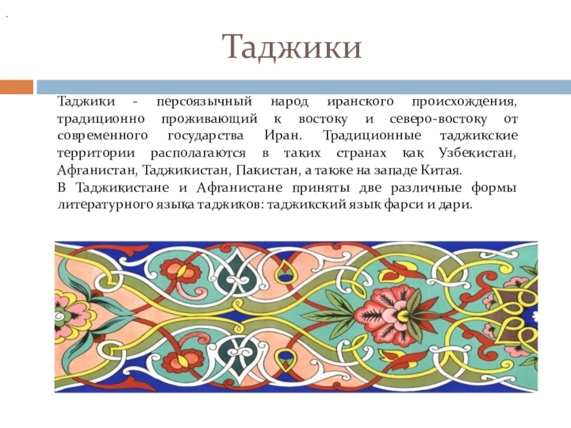 Таджики - персоязычный народ иранского происхождения, традиционно проживающий к востоку и