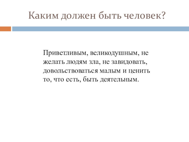 Приветливым, великодушным, не желать людям зла, не завидовать,