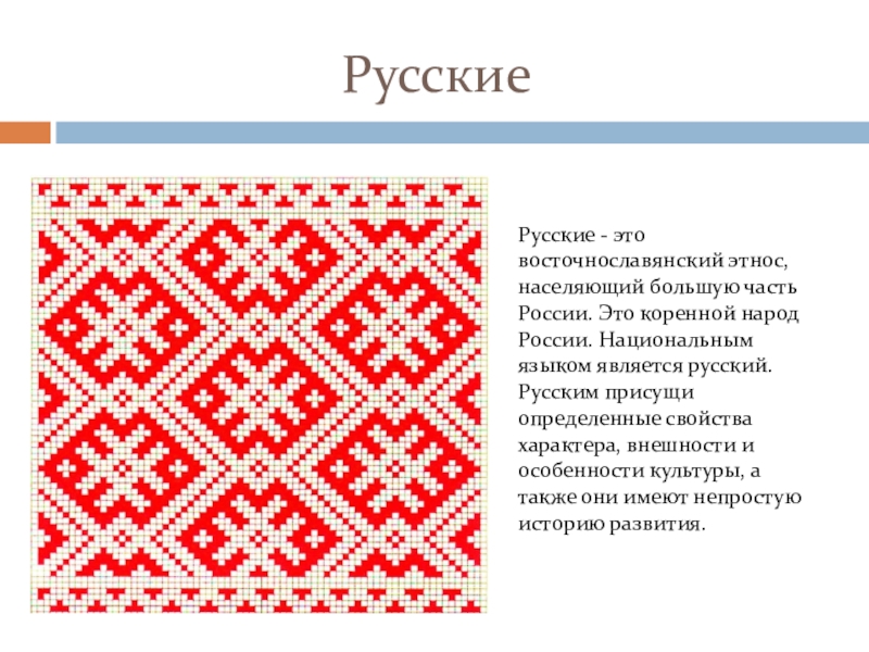 народ России. Национальным языком является русский. Русским присущи определенные свойства характера, внешности и особенности культуры, а также они имеют непростую историю развития.