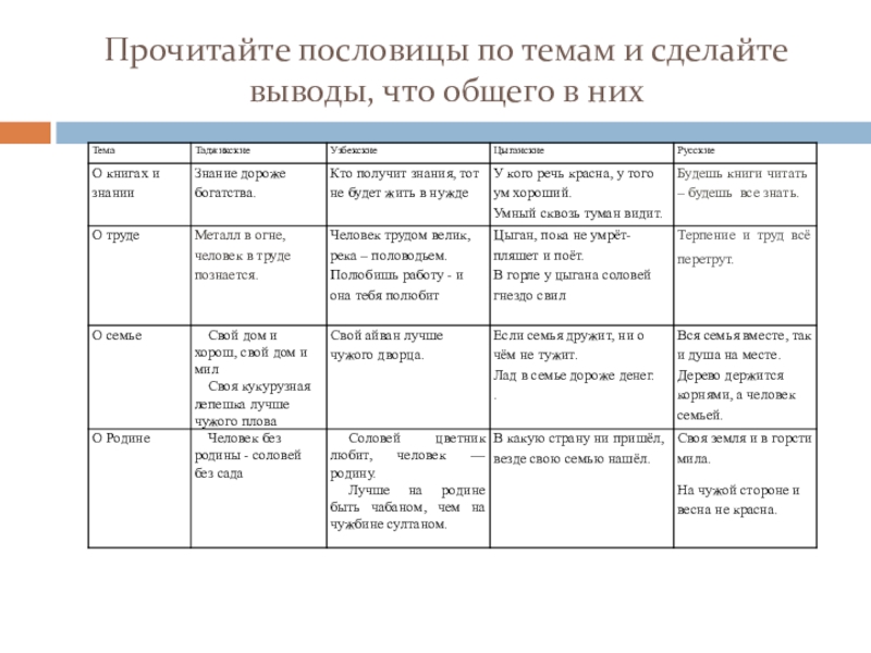 Слайд 12Прочитайте пословицы по темам и сделайте выводы, что общего в них