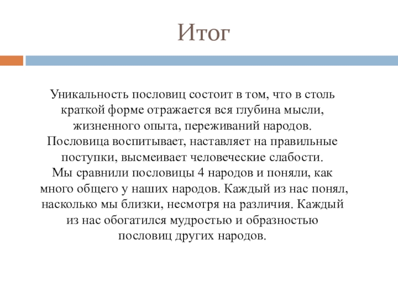 Мы сравнили пословицы 4 народов и поняли, как много общего у наших народов. Каждый из нас понял, насколько мы близки, несмотря на различия. Каждый из нас обогатился мудростью и образностью пословиц других народов.