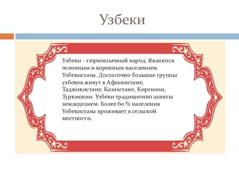 Узбеки - тюркоязычный народ. Являются основным и коренным населением Узбекистана. Достаточно