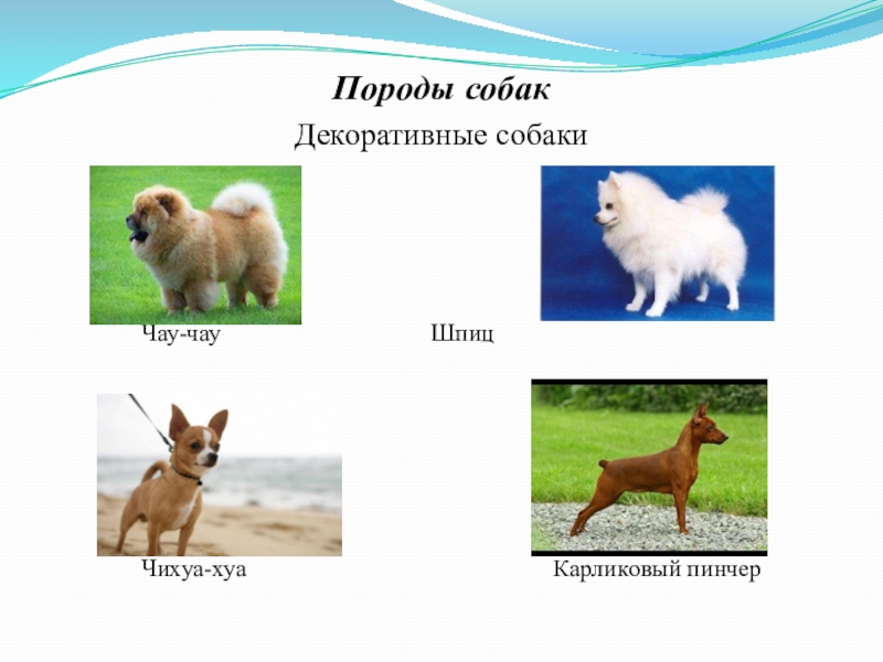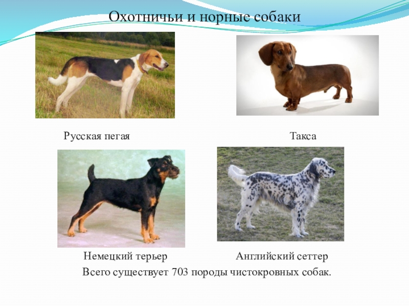 древнейших домашних животных (одомашнена, очевидно, 15-10 тыс. лет назад). Около 400 пород, которые делятся на 4 группы: охотничьи, служебные, спортивно-служебные, декоративные или комнатные. Собаки, особенно охотничьи, обладают острым зрением и тонким обонянием (чутьём). Половой зрелости достигают к 8-9 месяцам. Оптимальный возраст для вязки