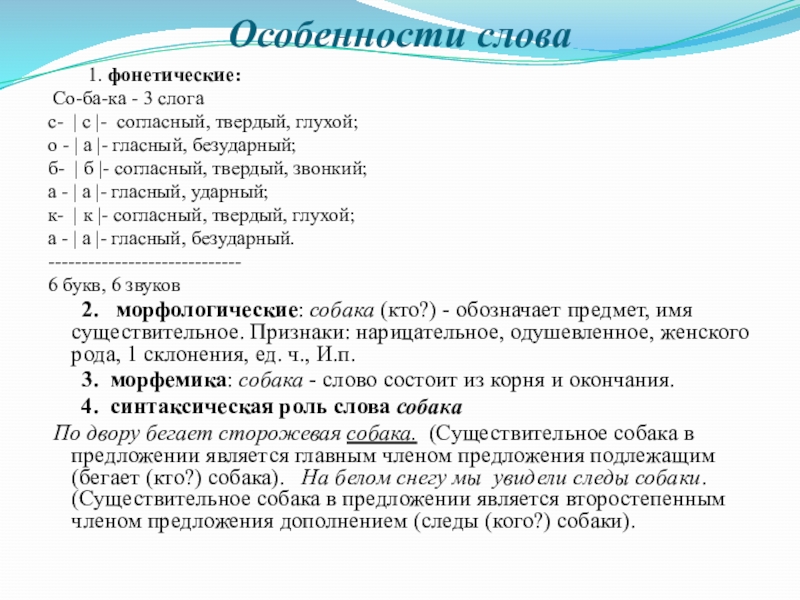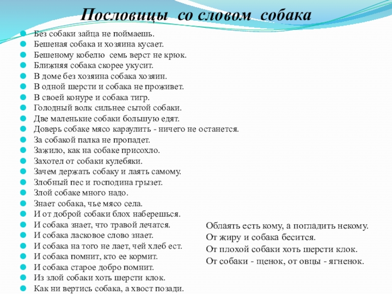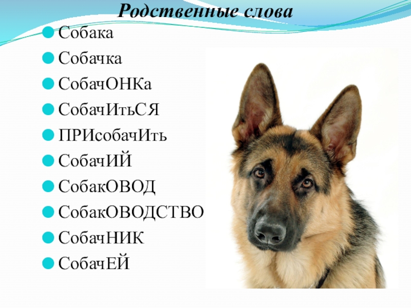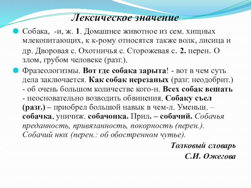Фразеологизмы. Вот где собака зарыта! - вот в чем суть дела заключается. Как собак нерезаных (разг. неодобрит.) - об очень большом количестве кого-н. Всех собак вешать - неосновательно возводить обвинения. Собаку съел (разг.) – приобрел большой навык в чем-л. Уменьш. – собачка, уничиж. собачонка. Прил. – собачий. Собачья преданность, привязанность, покорность (перен.). Собачий нюх (перен.: об обостренном чутье).