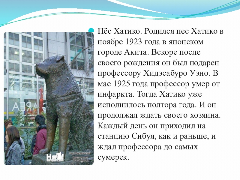 городе Акита. Вскоре после своего рождения он был подарен профессору Хидэсабуро Уэно. В мае 1925 года профессор умер от инфаркта. Тогда Хатико уже исполнилось полтора года. И он продолжал ждать своего хозяина. Каждый день он приходил на станцию Сибуя, как и раньше, и ждал профессора до самых сумерек.
