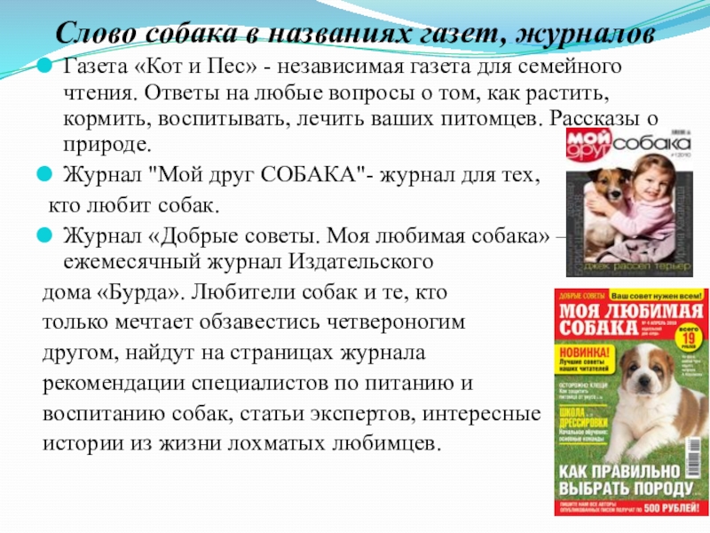 выбрал слово собака. Мне было интересно работать с этим словом. Я заметил, что это слово очень часто употребляется в нашей речи и в прямом, и в переносном значении. Оно встречается во многих пословицах, фразеологизмах. Часто собаки являются героями рассказов, фильмов. Мне захотелось собрать информацию об этом слове из различных источников, проследить за жизнью слова в языке.