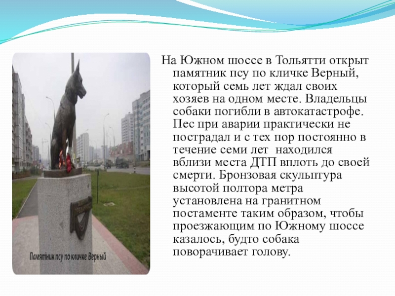 Слайд 49На Южном шоссе в Тольятти открыт памятник псу по кличке Верный,