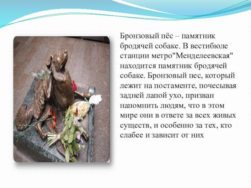Слайд 51Бронзовый пёс – памятник бродячей собаке. В вестибюле станции метро"Менделеевская" находится