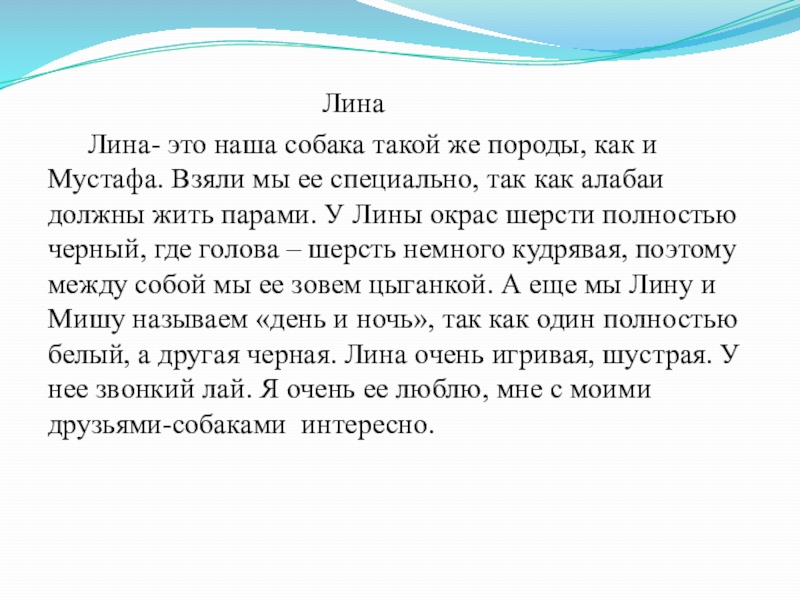 Лина- это наша собака такой же породы, как и Мустафа. Взяли мы ее специально, так как алабаи должны жить парами. У Лины окрас шерсти полностью черный, где голова – шерсть немного кудрявая, поэтому между собой мы ее зовем цыганкой. А еще мы Лину и Мишу называем «день и ночь», так как один полностью белый, а другая черная. Лина очень игривая, шустрая. У нее звонкий лай. Я очень ее люблю, мне с моими друзьями-собаками интересно.