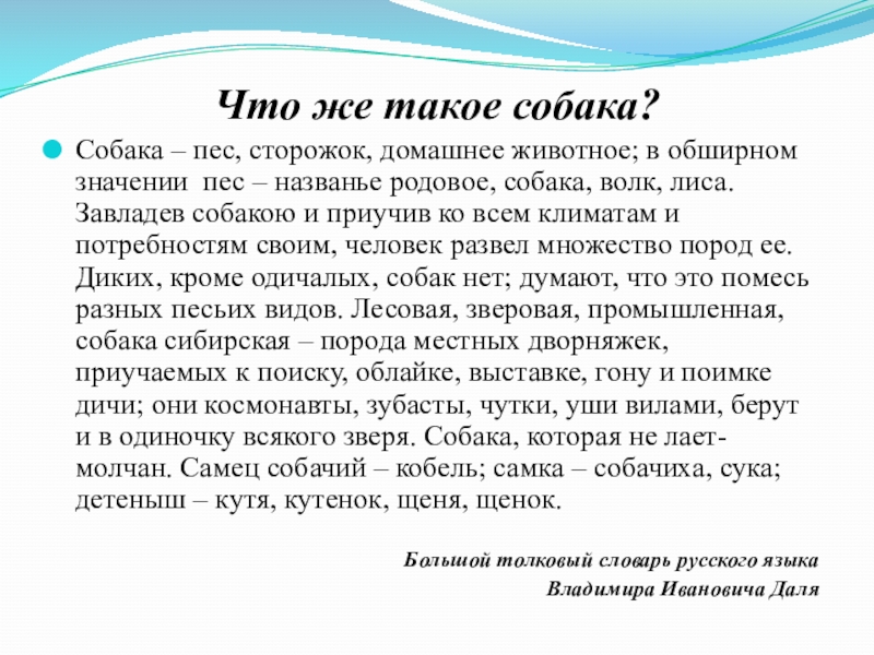 значении пес – названье родовое, собака, волк, лиса. Завладев собакою и приучив ко всем климатам и потребностям своим, человек развел множество пород ее. Диких, кроме одичалых, собак нет; думают, что это помесь разных песьих видов. Лесовая, зверовая, промышленная, собака сибирская – порода местных дворняжек, приучаемых к поиску, облайке, выставке, гону и поимке дичи; они космонавты, зубасты, чутки, уши вилами, берут и в одиночку всякого зверя. Собака, которая не лает- молчан. Самец собачий – кобель; самка – собачиха, сука; детеныш – кутя, кутенок, щеня, щенок.