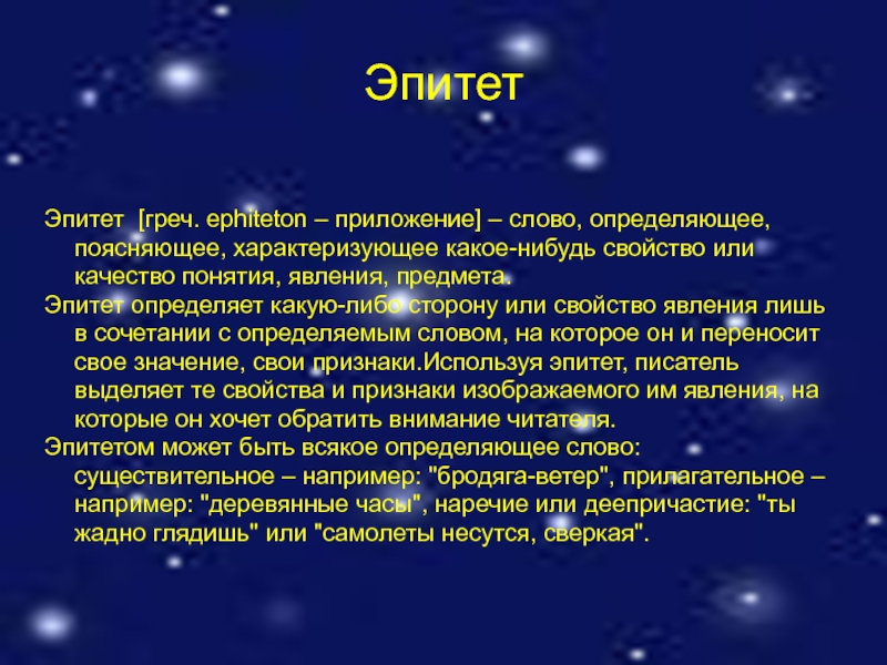 Эпитет [греч. ephiteton – приложение] – слово, определяющее, поясняющее, характеризующее какое-нибудь