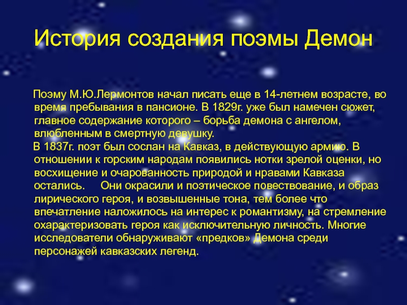 14-летнем возрасте, во время пребывания в пансионе. В 1829г. уже был намечен сюжет, главное содержание которого – борьба демона с ангелом, влюбленным в смертную девушку.