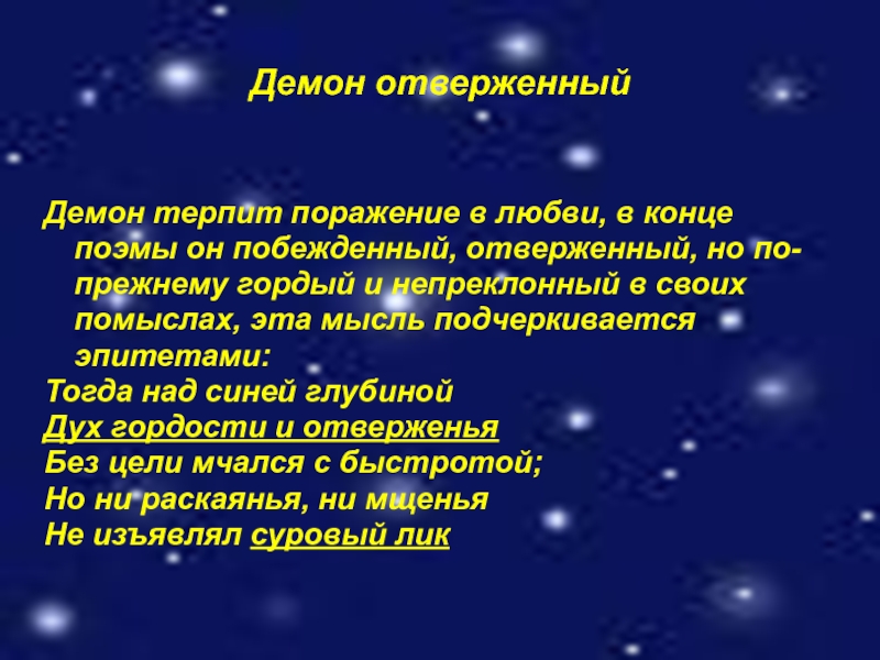 Демон терпит поражение в любви, в конце поэмы он побежденный,