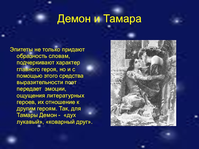 героя, но и с помощью этого средства выразительности поэт передает эмоции, ощущения литературных героев, их отношение к другим героям. Так, для Тамары Демон - «дух лукавый», «коварный друг».