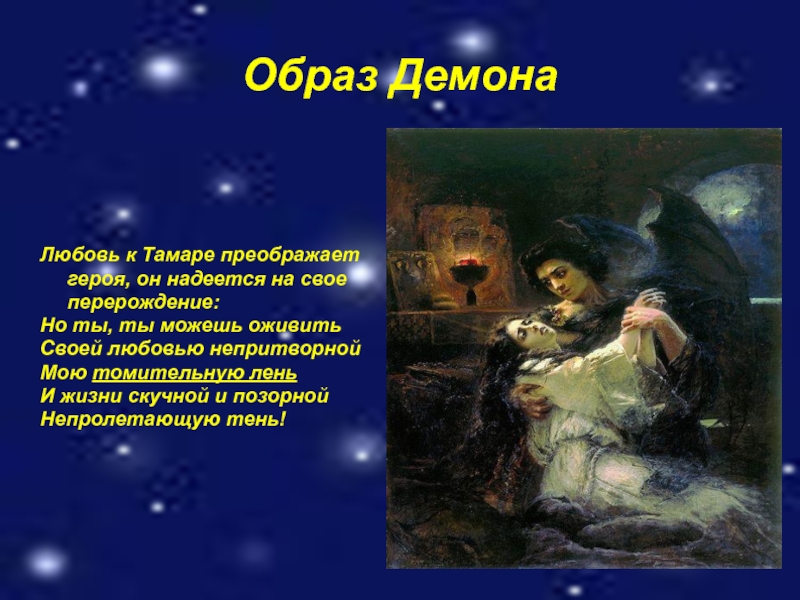 Любовь к Тамаре преображает героя, он надеется на свое перерождение: