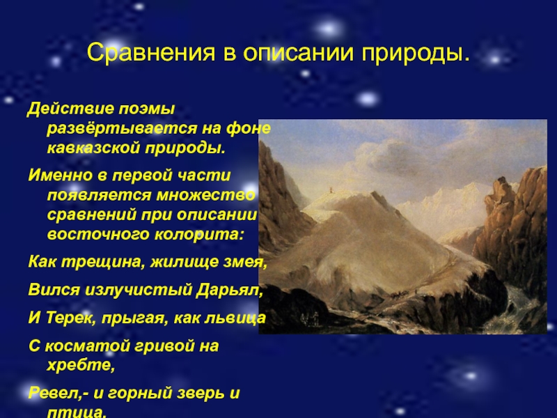 Сравнения,эпитеты, помогающие создать образ природы в поэме Лермонтова «Демон»