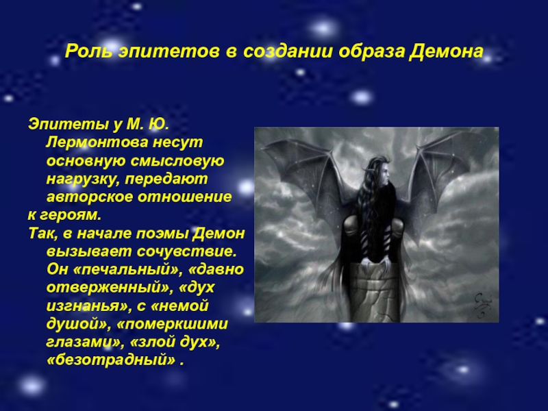 Слайд 1Роль эпитетов и сравнений в поэме М.Ю.Лермонтова“Демон”