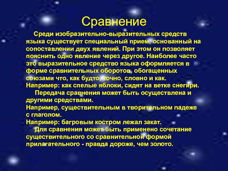 на сопоставлении двух явлений. При этом он позволяет пояснить одно явление через другое. Наиболее часто это выразительное средство языка оформляется в форме сравнительных оборотов, обогащенных союзами что, как будто, точно, словно и как. Например: как спелые яблоки, сидят на ветке снегири.