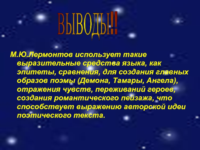 главных образов поэмы (Демона, Тамары, Ангела), отражения чувств, переживаний героев, создания романтического пейзажа, что способствует выражению авторской идеи поэтического текста.