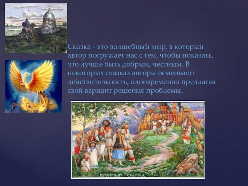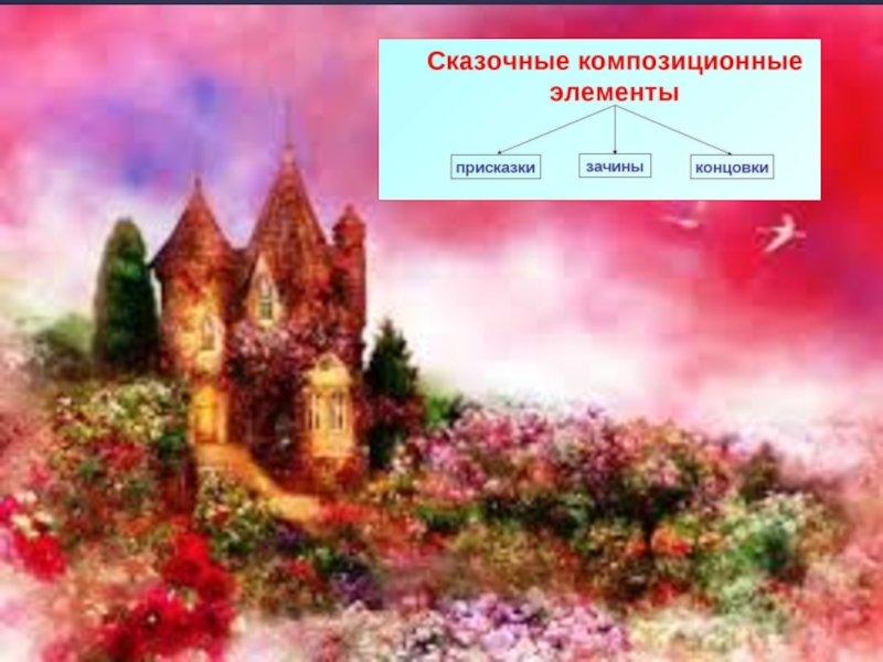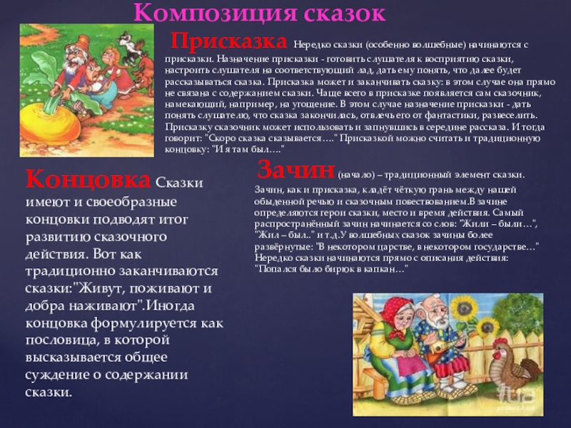 Концовка Сказки имеют и своеобразные концовки подводят итог развитию сказочного действия. Вот как традиционно заканчиваются сказки:"Живут, поживают и добра наживают".Иногда концовка формулируется как пословица, в которой высказывается общее суждение о содержании сказки.