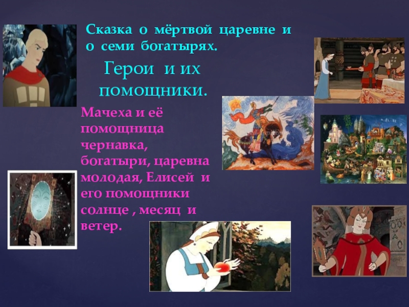 Мачеха и её помощница чернавка, богатыри, царевна молодая, Елисей и его помощники солнце , месяц и ветер.