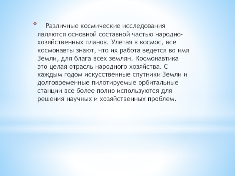Слайд 9 Различные космические исследования являются основной составной частью народно-хозяйственных планов. Улетая