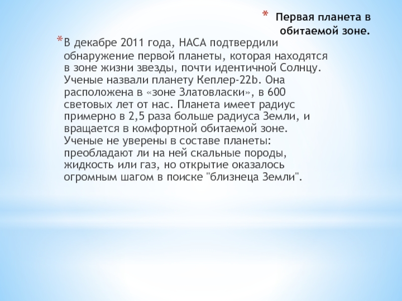 первой планеты, которая находятся в зоне жизни звезды, почти идентичной Солнцу. Ученые назвали планету Кеплер-22b. Она расположена в «зоне Златовласки», в 600 световых лет от нас. Планета имеет радиус примерно в 2,5 раза больше радиуса Земли, и вращается в комфортной обитаемой зоне. Ученые не уверены в составе планеты: преобладают ли на ней скальные породы, жидкость или газ, но открытие оказалось огромным шагом в поиске "близнеца Земли".