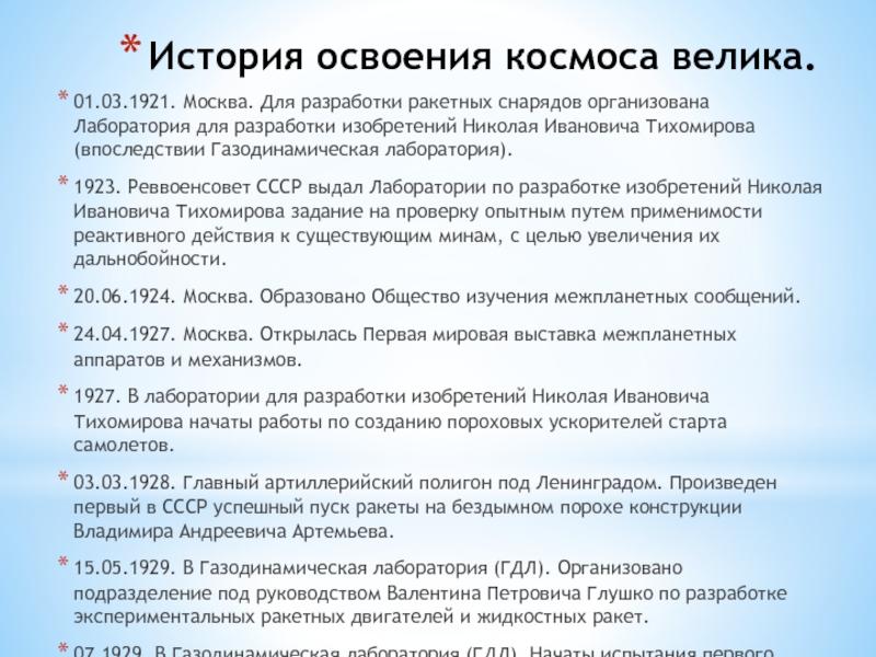 01.03.1921. Москва. Для разработки ракетных снарядов организована Лаборатория