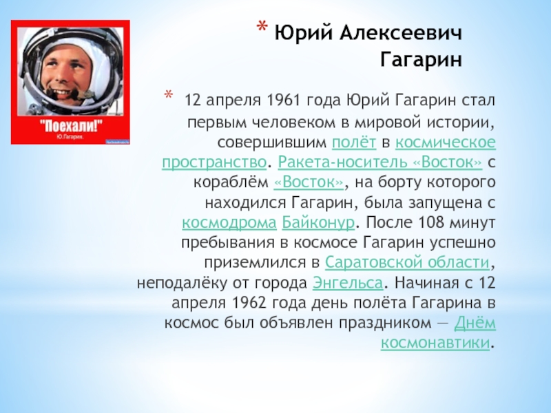 первым человеком в мировой истории, совершившим полёт в космическое пространство. Ракета-носитель «Восток» с кораблём «Восток», на борту которого находился Гагарин, была запущена с космодрома Байконур. После 108 минут пребывания в космосе Гагарин успешно приземлился в Саратовской области, неподалёку от города Энгельса. Начиная с 12 апреля 1962 года день полёта Гагарина в космос был объявлен праздником — Днём космонавтики.
