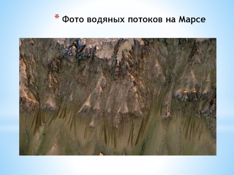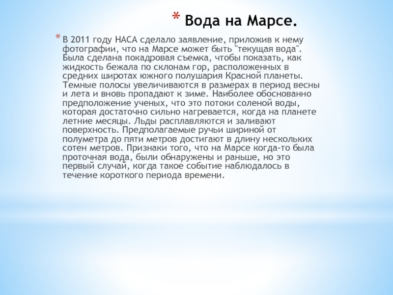фотографии, что на Марсе может быть "текущая вода". Была сделана покадровая съемка, чтобы показать, как жидкость бежала по склонам гор, расположенных в средних широтах южного полушария Красной планеты. Темные полосы увеличиваются в размерах в период весны и лета и вновь пропадают к зиме. Наиболее обоснованно предположение ученых, что это потоки соленой воды, которая достаточно сильно нагревается, когда на планете летние месяцы. Льды расплавляются и заливают поверхность. Предполагаемые ручьи шириной от полуметра до пяти метров достигают в длину нескольких сотен метров. Признаки того, что на Марсе когда-то была проточная вода, были обнаружены и раньше, но это первый случай, когда такое событие наблюдалось в течение короткого периода времени.