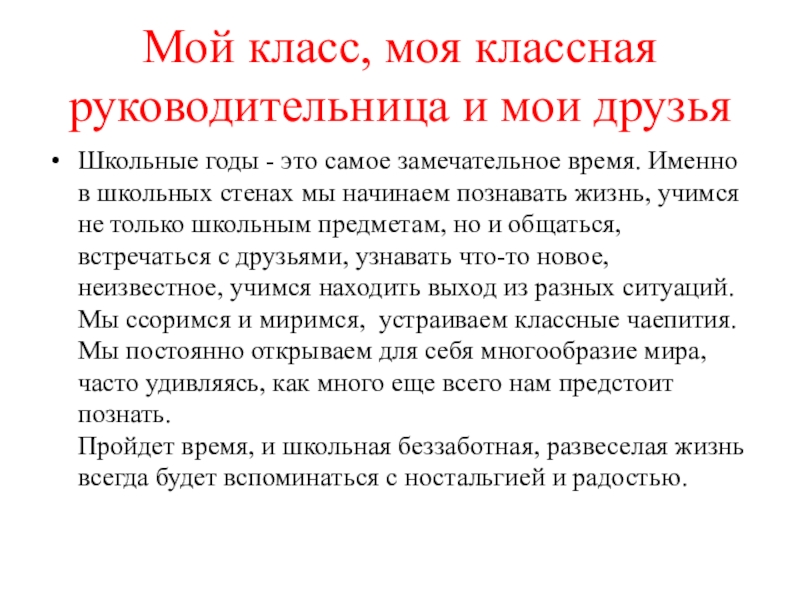 самое замечательное время. Именно в школьных стенах мы начинаем познавать жизнь, учимся не только школьным предметам, но и общаться, встречаться с друзьями, узнавать что-то новое, неизвестное, учимся находить выход из разных ситуаций. Мы ссоримся и миримся, устраиваем классные чаепития. Мы постоянно открываем для себя многообразие мира, часто удивляясь, как много еще всего нам предстоит познать.