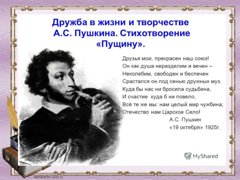 трудных жизненных ситуациях. Вспомним лицейского друга Пушкина – Ивана Пущина, навестившего опального поэта в Михайловской ссылке и скрасившего его одиночество. Вспомним военные годы, когда солдаты, рискуя собственной жизнью, выносили с поля боя раненых товарищей. Вспомним, как в нашей собственной жизни беда, разделённая с друзьями, уже не казалась такой непоправимой.