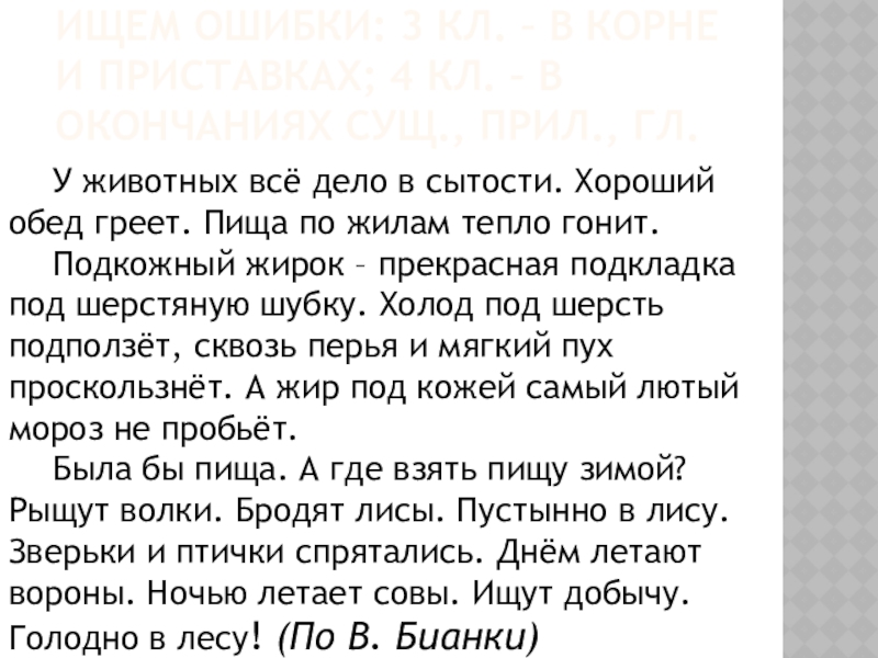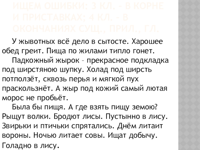 Была бы пища. А где взять пищу зимой? Рыщут волки. Бродят лисы. Пустынно в лису. Зверьки и птички спрятались. Днём летают вороны. Ночью летает совы. Ищут добычу. Голодно в лесу! (По В. Бианки)
