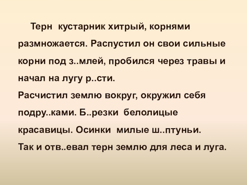 Слайд 7 Терн кустарник хитрый, корнями размножается. Распустил он свои сильные корни под
