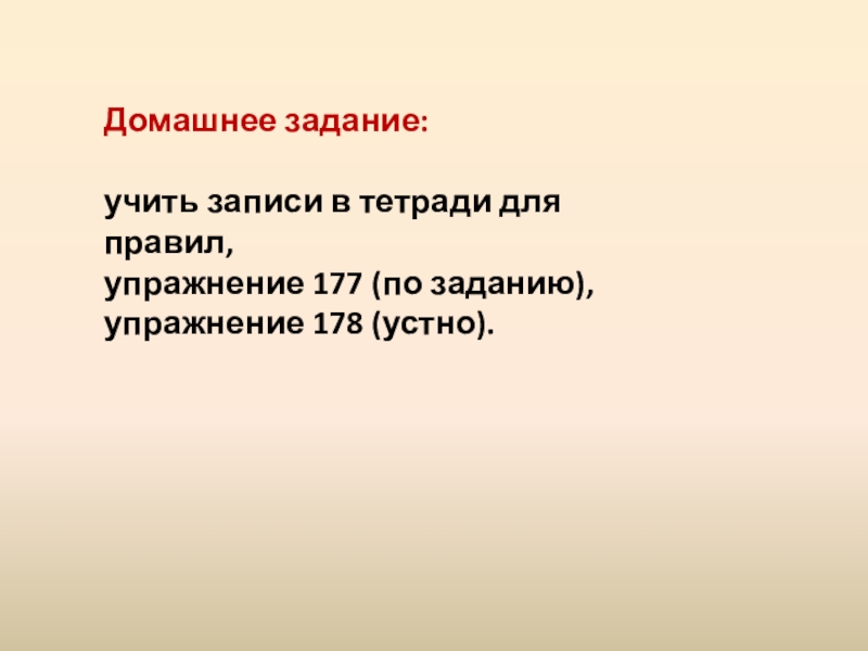 Домашнее задание:учить записи в тетради для правил, упражнение 177 (по заданию),упражнение 178 (устно).