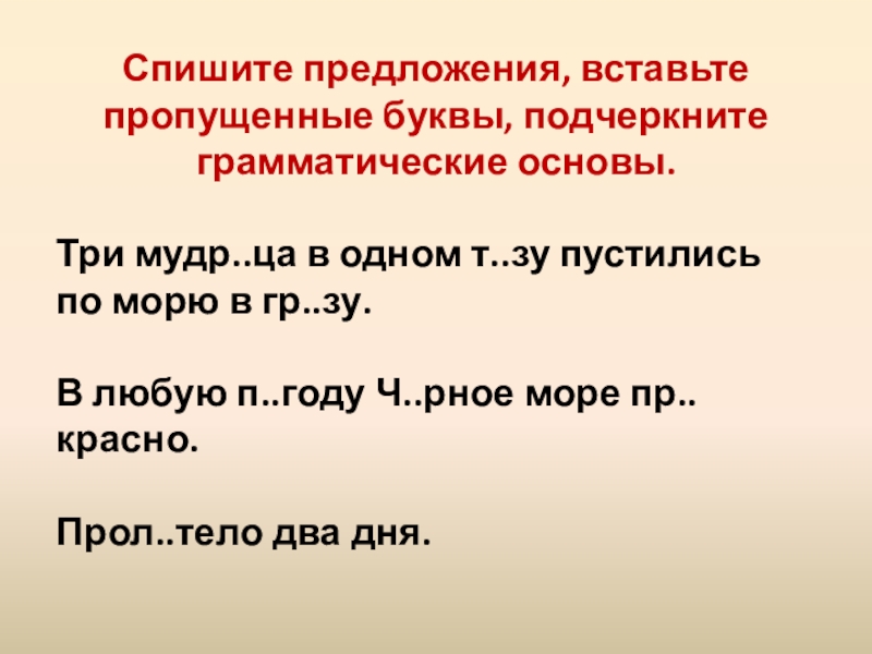 Слайд 3Спишите предложения, вставьте пропущенные буквы, подчеркните грамматические основы.