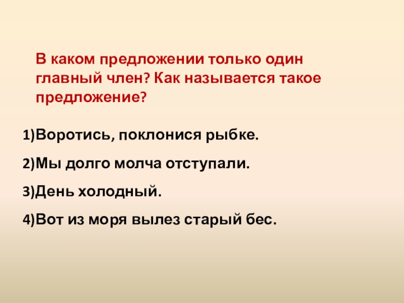 В каком предложении только один главный член? Как называется такое предложение?Воротись, поклонися рыбке.Мы долго молча отступали.День холодный.Вот