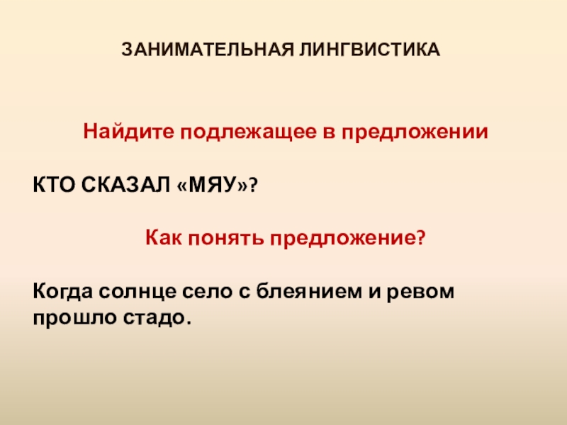 ЗАНИМАТЕЛЬНАЯ ЛИНГВИСТИКАНайдите подлежащее в предложенииКТО СКАЗАЛ «МЯУ»?Как понять предложение?Когда солнце село с блеянием и ревом прошло стадо.