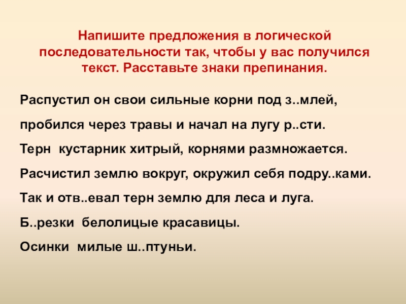 Слайд 6Напишите предложения в логической последовательности так, чтобы у вас получился текст.