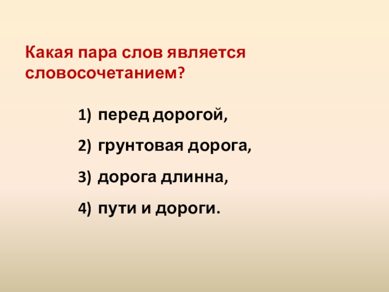 Какая пара слов является словосочетанием?перед дорогой,грунтовая дорога,дорога длинна,пути и дороги.