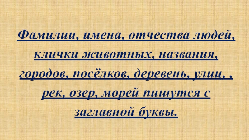 Фамилии, имена, отчества людей, клички животных, названия, городов, посёлков, деревень, улиц, , рек, озер, морей пишутся